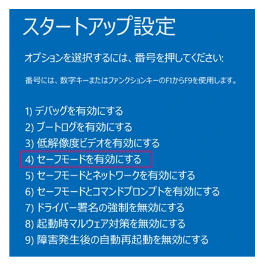 Step5:キーボードのF4キーを押し、「セーフモードを有効にする」を選択します。