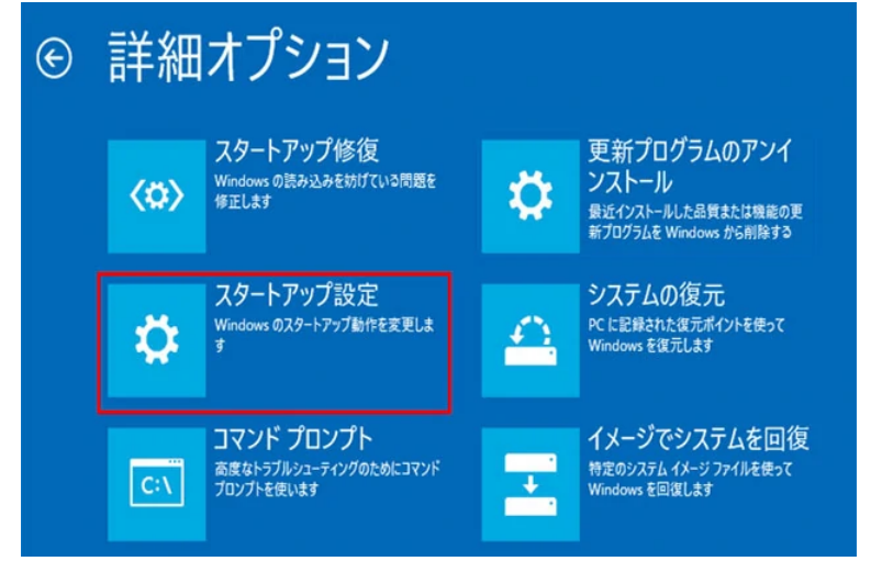 Step3:「詳細オプション」―「スタートアップ設定」へ進みます。