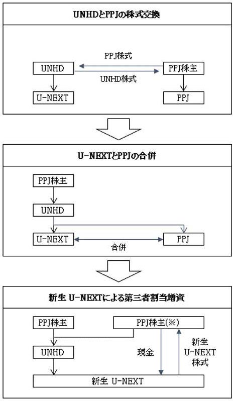 経営統合は次の手順で行います。まずPPJと、U-NEXTの株主である株式会社USEN-NEXT HOLDINGS(以下「UNHD」)が2023年3月31日付で株式交換を実施します。これによりUNHDはPPJの全株式を取得、PPJの株主であるTBSホールディングス、日本経済新聞社、テレビ東京ホールディングス、WOWOW、電通グループ、博報堂DYメディアパートナーズなどがそれぞれUNHDの株式を取得します。続いて同日付でPPJとU-NEXTが合併し、U-NEXTが存続会社となります。統合した新生U-NEXTは同年3月31日に発足します。本合併後に新生U-NEXTがTBSホールディングス及び博報堂DYメディアパートナーズを第三者割当増資引受先とした、第三者割当増資を実施します。これにより、TBSホールディングス及び博報堂DYメディアパートナーズは新生U-NEXTの株式を4月1日に取得いたします。