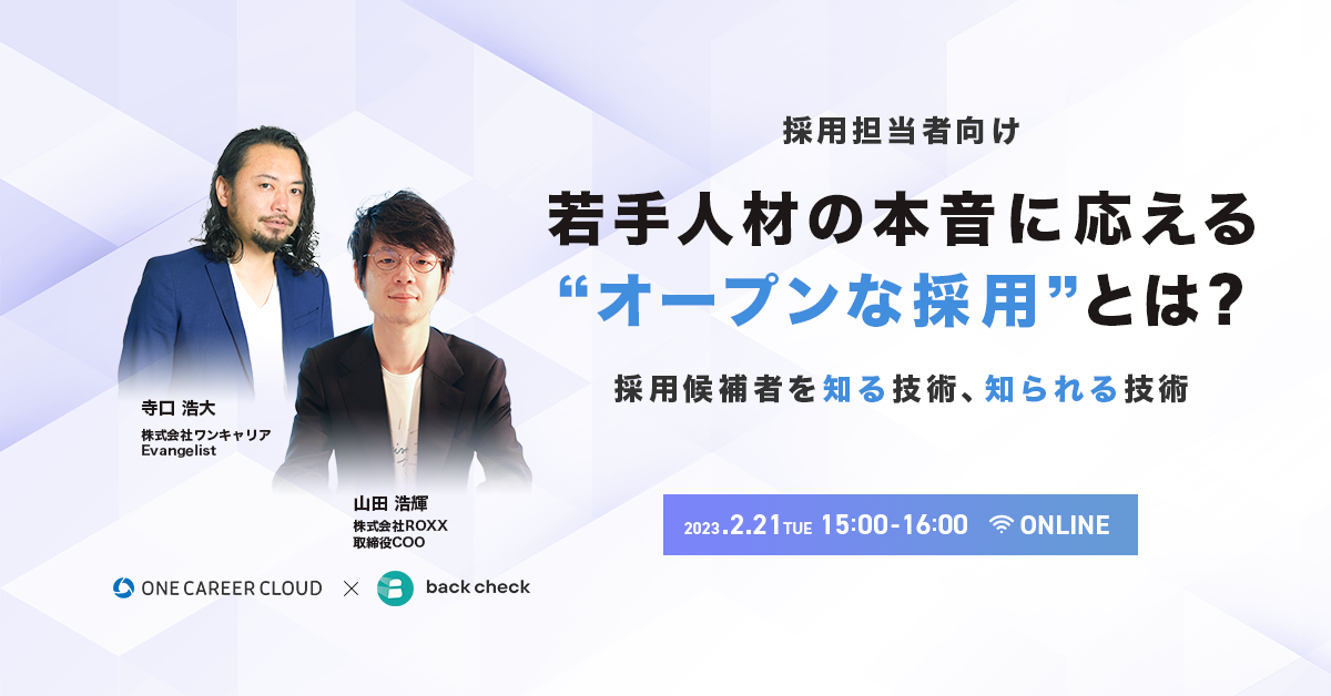 今回は、採用DXを実現する新卒採用サービス『ONE CAREER CLOUD』を手掛ける、株式会社ワンキャリア Evangelist 寺口浩大氏をお招きし、弊社 取締役COOの山田とともに若手世代の価値観の変化からキャリア志向性を紐解き、さらに優秀な若手人材を惹きつける「オープンな採用」を体現するための手法について、パネルディスカッション形式で議論します。