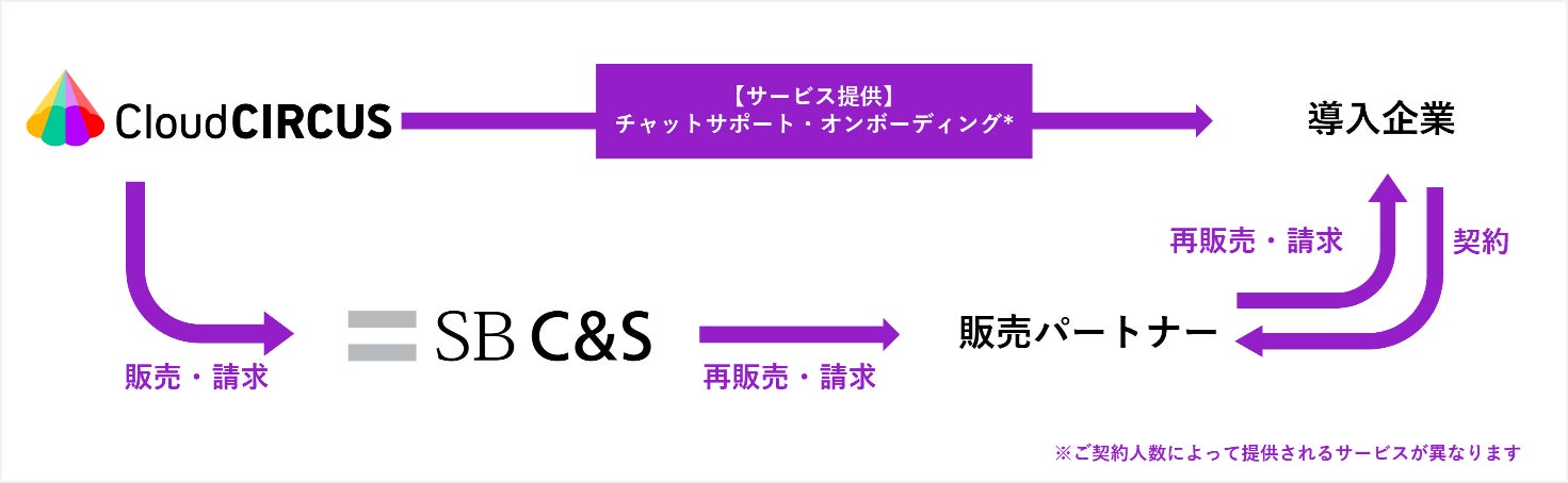 クラウドサーカス:導入企業に対して、「Cloud CIRCUS」各種SaaSの提供と、チャットサポートやオンボーディングをおこないます 。SB C&Sに対して、「Cloud CIRCUS」各種SaaSの販売、料金請求をおこないます。