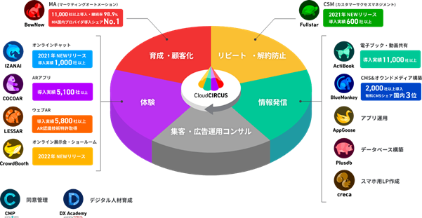 「Cloud CIRCUS」は、デジタルマーケティングのSaaS総称サービスです。「驚くほど簡単に顧客を増やせるしくみ」をスローガンに、2015年から提供を開始し、顧客を増やす5つの課題領域「情報発信」「集客」「顧客体験価値向上」「見込み顧客育成と顧客化」「解約防止・リピート増」を総合して実現。計11種のSaaSツールが入っています。これまで累計38,000件以上(2022年9月末時点)の企業の収益拡大における支援をおこなってまいりました。企業が「Cloud CIRCUS」を使いARをポスター等、紙媒体に設定することで自社Webサイトへの顧客誘導を促進。Webサイトの閲覧履歴を計測、自社の製品やサービスに興味がある有望な顧客を割り出し、顧客の関心事に合ったシナリオに基づいて電子メールを送信するといった自動的な販売促進活動が可能です。