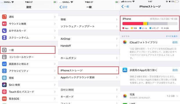 アップデートするために十分なストレージスペースがない場合、アップデートができないことがあります。このような場合は、以下の手順で不要なデータを削除してストレージの空き容量を増やしてください。