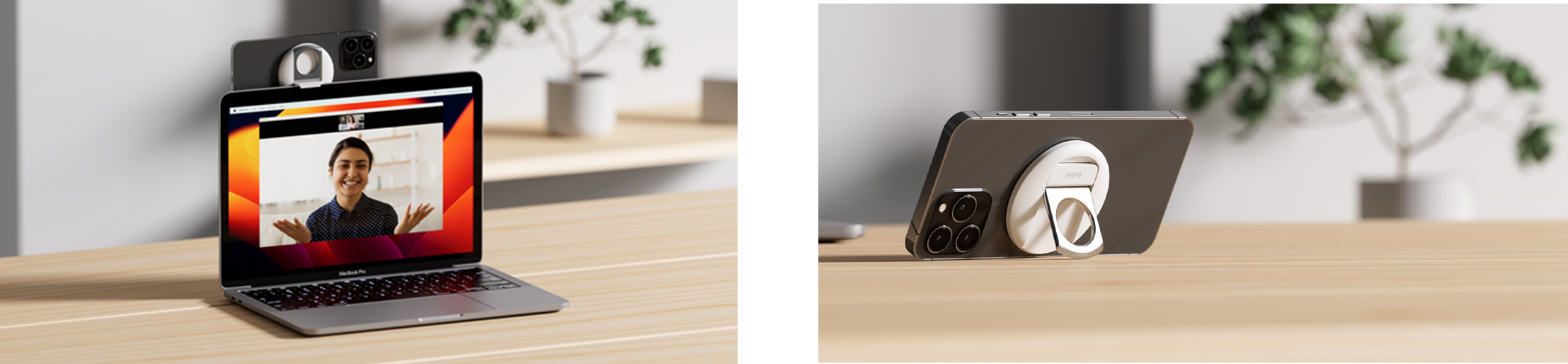 本製品はWWDCで紹介されたAppleとBelkin共同開発された製品であり、macOS Venturaの連携カメラ機能に最適なiPhoneマウントです。Macノートパソコンの画面上部に取り付るだけで、iPhoneを瞬時にWebカメラに変身させ、FaceTimeやオンライン会議を高画質で行うことができます。