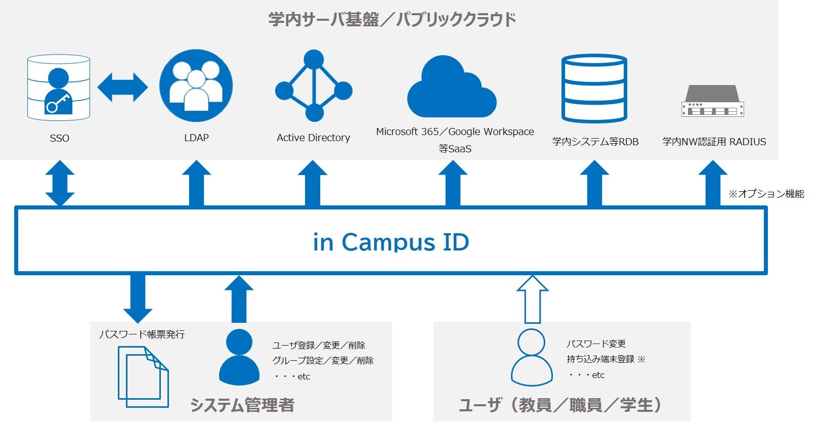 「in Campus ID」は、学内のIDおよびパスワード情報を各システムにプロビジョニング※1するサービスです。ID管理という概念にとらわれず、学内ネットワーク環境への接続端末の管理機能も備え、教育現場における多様な運用シーンに対応したIDライフサイクル管理へ柔軟に対応します。また、教育現場に必要な搭載機能に特化することでコストパフォーマンスも高めています。