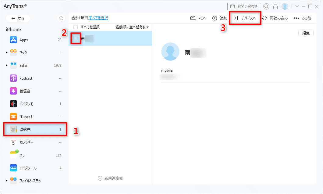 とても簡単でしょう。AnyTransは連絡先を転送だけではなく、削除(個別・複数・すべてを一括削除)、編集、バックアップなど便利な機能もあるので、ぜひお試しください。