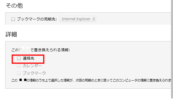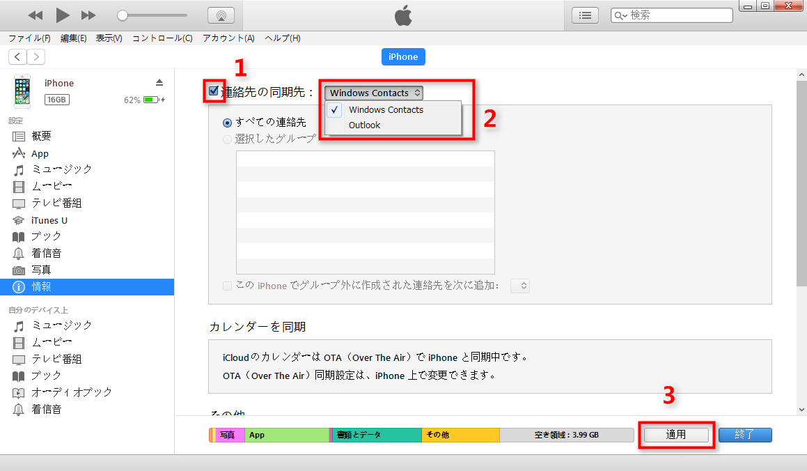 Step3: 「連絡先の同期先」をチェックして、希望の保存先を選択して、「適用」をクリックします。