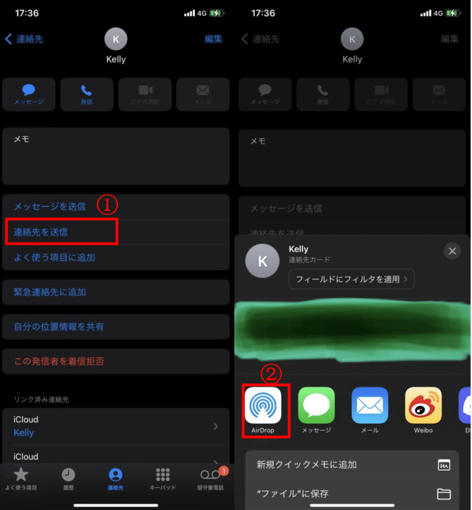 Step2:「連絡先を送信」をタッチし、メールかAirdropを選択し、転送先をタッチすれば別のiPhoneまたはメールに転送できます。