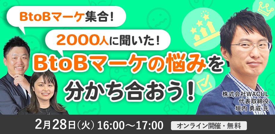 「AIアナリスト」等を提供する株式会社WACUL(本社:東京都千代田区、代表取締役社長:大淵亮平、以下「WACUL社」)と、「BtoBマーケ集合!2000人に聞いた!BtoBマーケの悩みを分かち合おう!」をテーマとしたセミナーを2023年2月28日(火)に開催します。