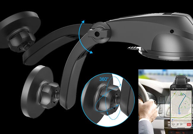 アーム部は上下に調整可能、マグネットホルダー部は自由自在に動くボールジョイント構造により、360度調整可能です。