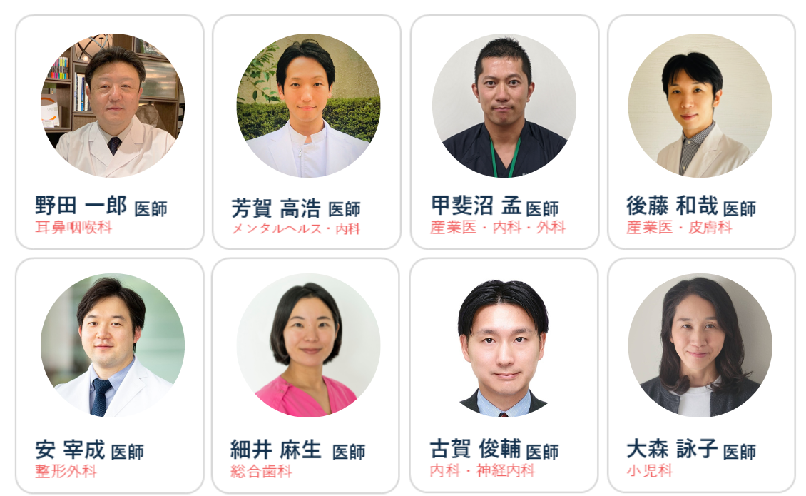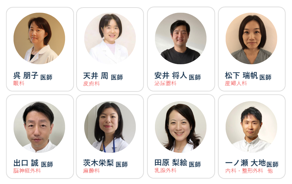 総合診療科、内科、耳鼻咽喉科、外科、整形外科、産科・婦人科、神経内科(脳神経内科)、精神科(心療内科)、小児科、眼科、皮膚科、泌尿器科、歯科・口腔外科など、20以上の科目の専門医が在籍。