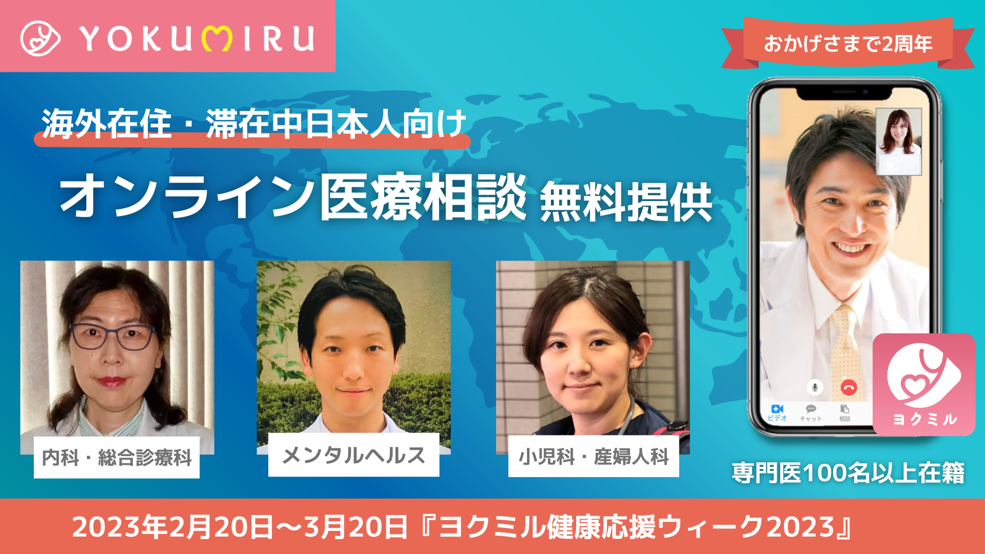 そこで昨年に続き、2月20日〜3月20日までの期間を『ヨクミル健康応援ウィーク2023』と題し、海外オンライン医療相談サービス『ヨクミル』を利用して、日本人専門医に直接相談ができる「オンライン医療相談」を無料で提供する運びとなりました。