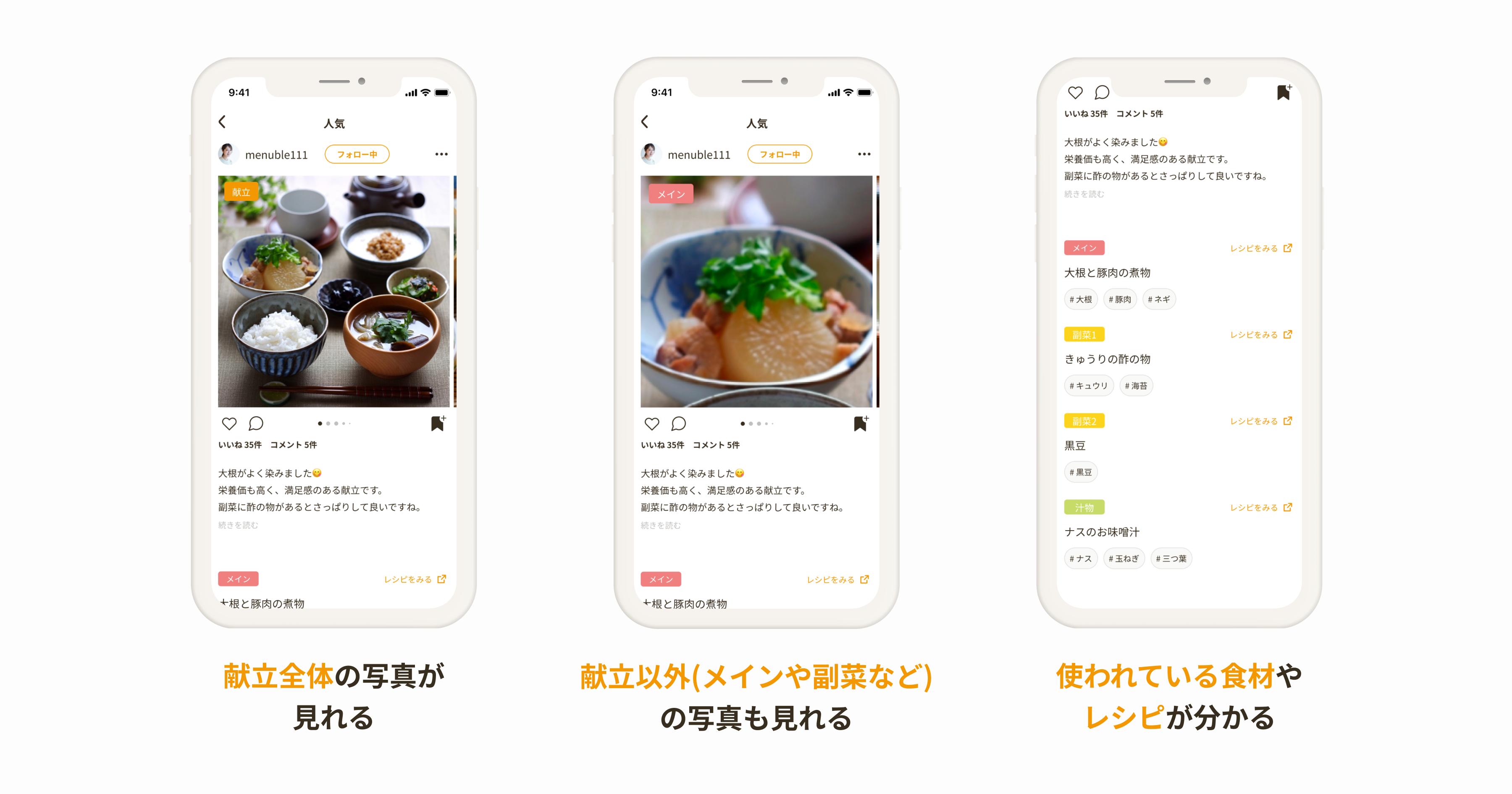献立全体の写真とあわせて、おかずそれぞれの写真が見れたり、この献立にはどんな食材が使われているのかが食材タグで分かります。作ってみたいと思う料理があったら、レシピサイトへ遷移できます。