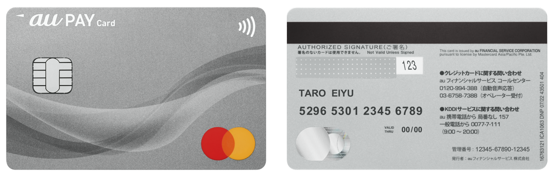 新しい「au PAYカード」は、高級感のあるデザイン券面にタッチ決済機能を標準搭載しスピーディーな決済を実現するとともに、お客さまの安全・安心のため大切なカード情報を裏面に集約することで、ご利用時におけるカード情報の盗み見などのリスクを低減します。