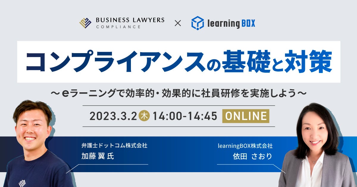 セミナーでは、コンプライアンスの基礎からその対策、eラーニングを活用した社員研修でコンプライアンス教育を効率的・効果的に進める方法などを分かりやすくご紹介いたします。今回の内容は、日本最大級の企業法務ポータルサイトBUSINESS LAWYERSを運営する弁護士ドットコムとeラーニングシステムのlearningBOXがコラボしてお届けします。
