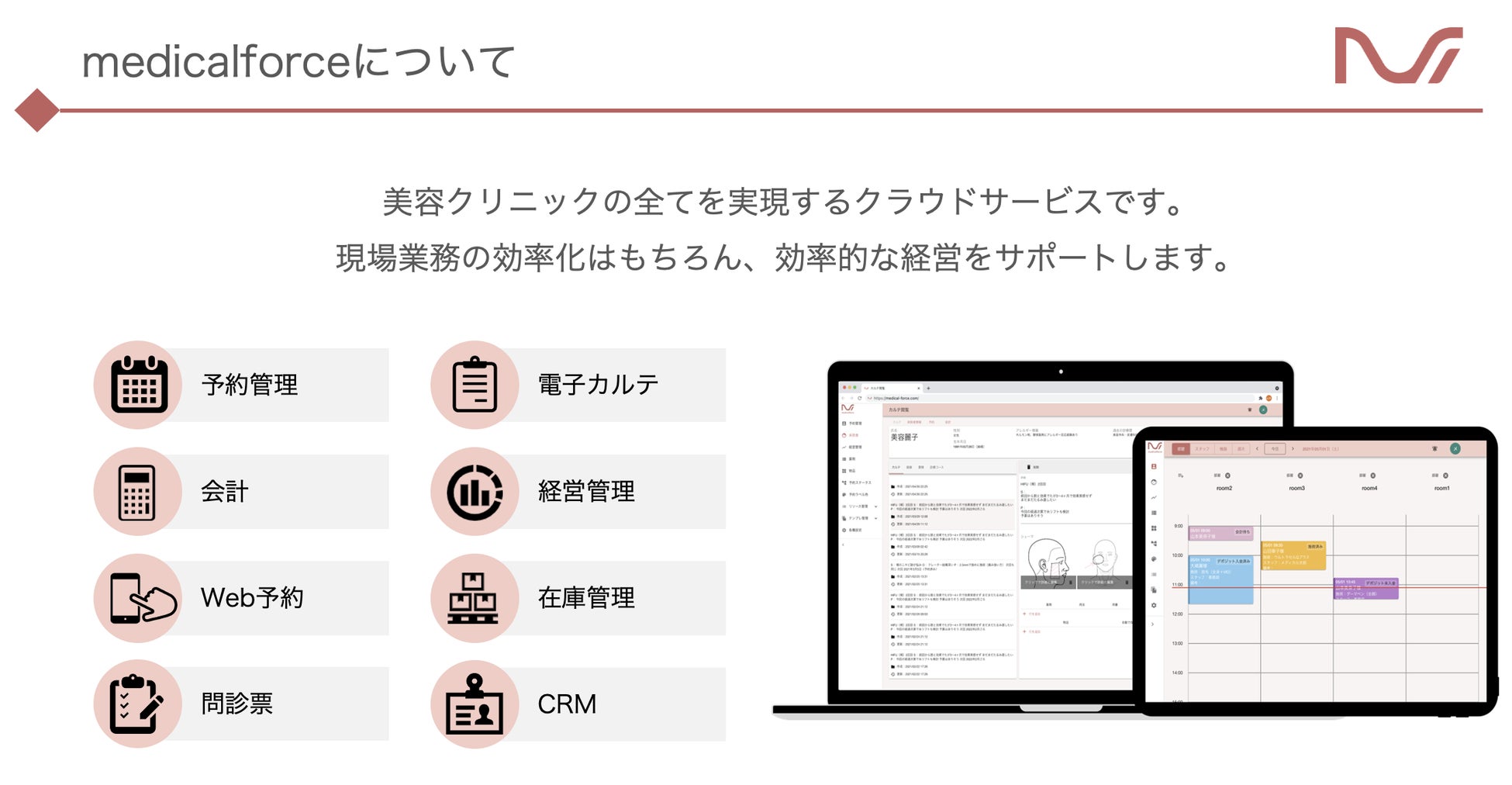 『medicalforce』は、美容クリニックの現場業務を一気通貫で管理・連携することができるAll in One SaaSです。予約、問診、カルテ、会計をはじめとする日常業務はもちろん、経営管理ダッシュボードやCRM(リマインド・ステップ配信)を搭載しており経営や集患の強化にもご活用いただけます。