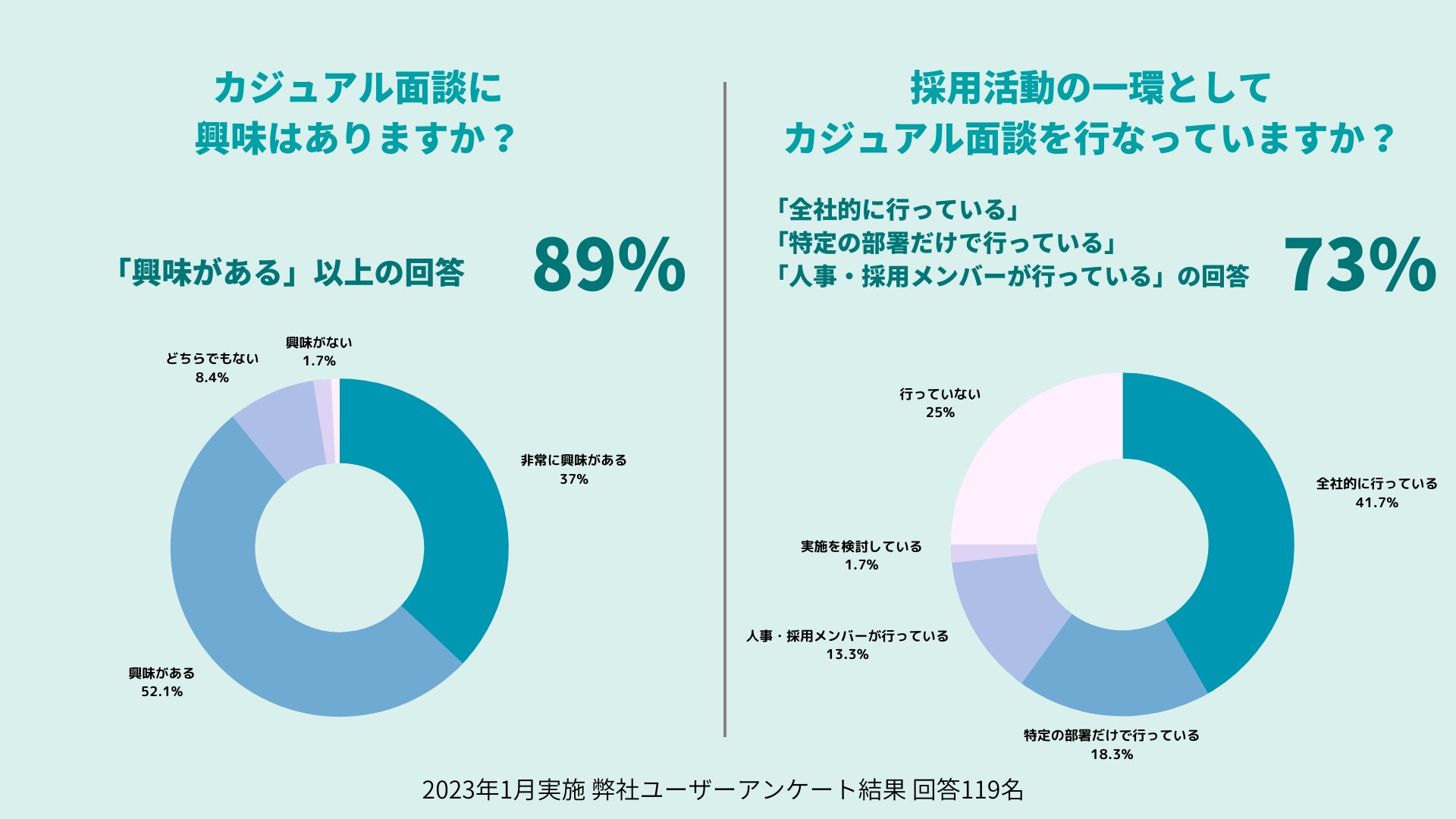 YOUTRUSTユーザーを対象に行ったアンケートにおいて、「カジュアル面談に興味がある」と答えた方は89%。また、YOUTRUSTをご利用中の企業の人事担当者において「採用活動の一環としてカジュアル面談を行っている」と答えた方は73.3%に及びました。