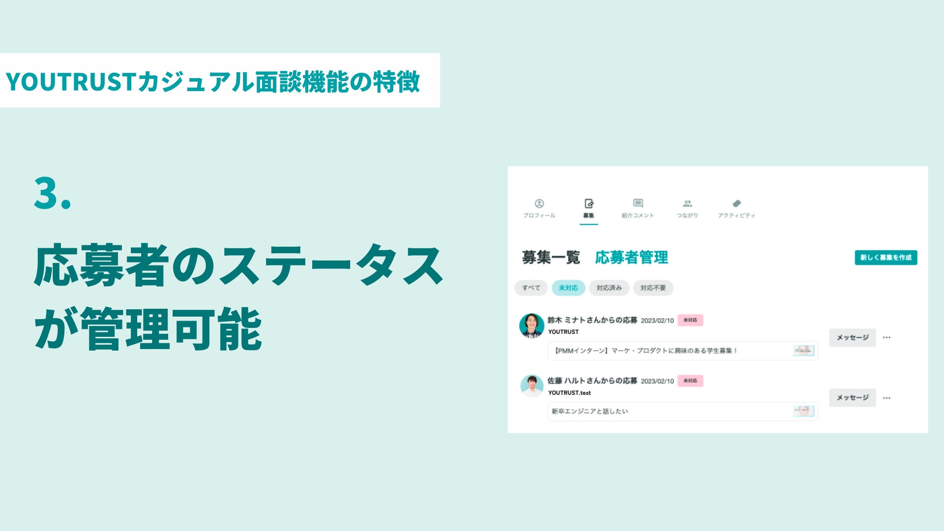 また、応募してくれた方とYOUTRUST上でつながることで意欲を確認することができます。(※有料でご契約いただいている方は2次のつながり範囲の意欲を確認することができます。)