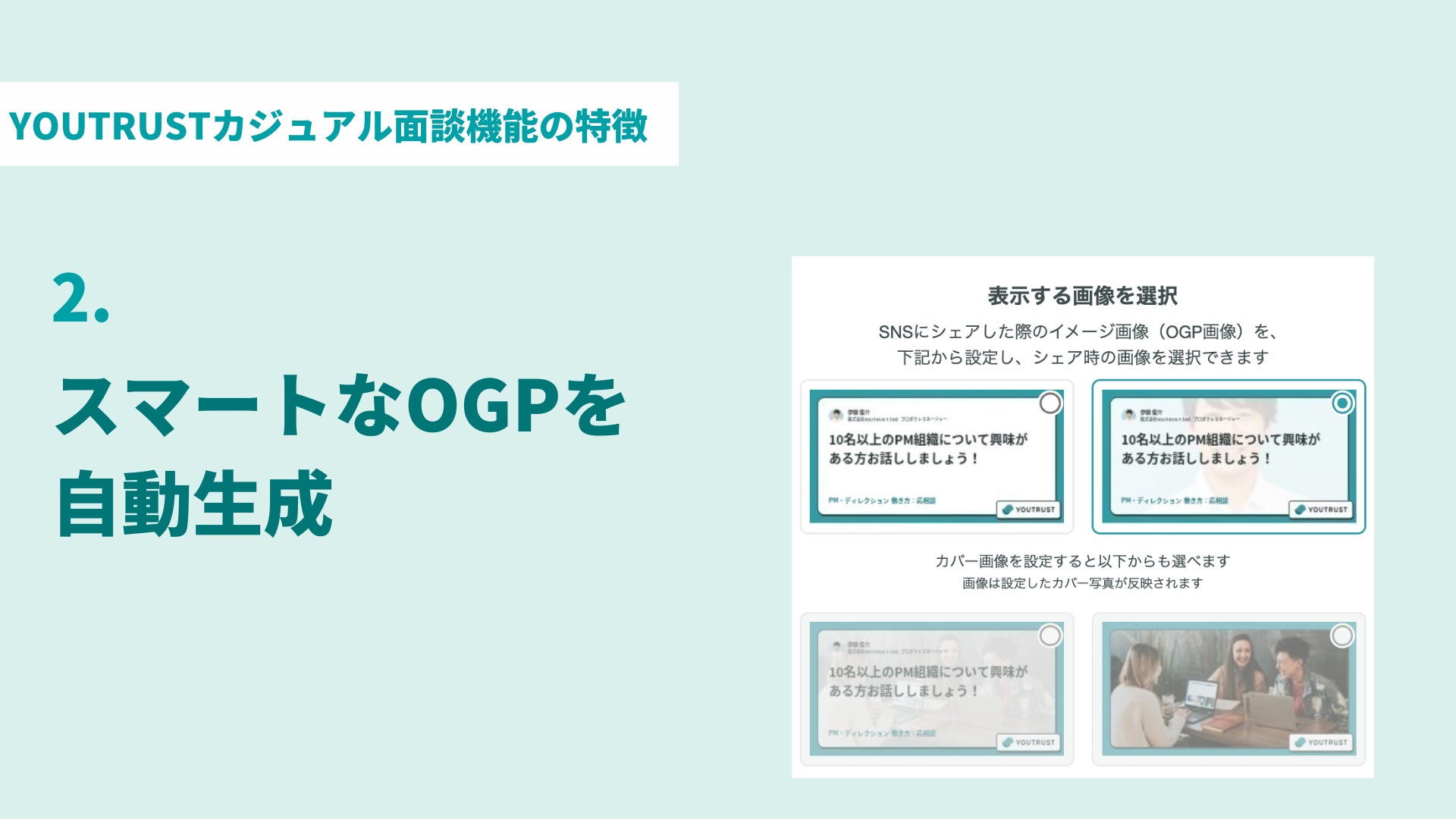 YOUTRUSTの新募集は、入力されたタイトルから自動で画像を生成します。より、こだわりたい方は画像を設定して独自のOGP画像を設定する事も可能となりました。加えてタグを設定する事で会社の魅力を伝えることもできます。