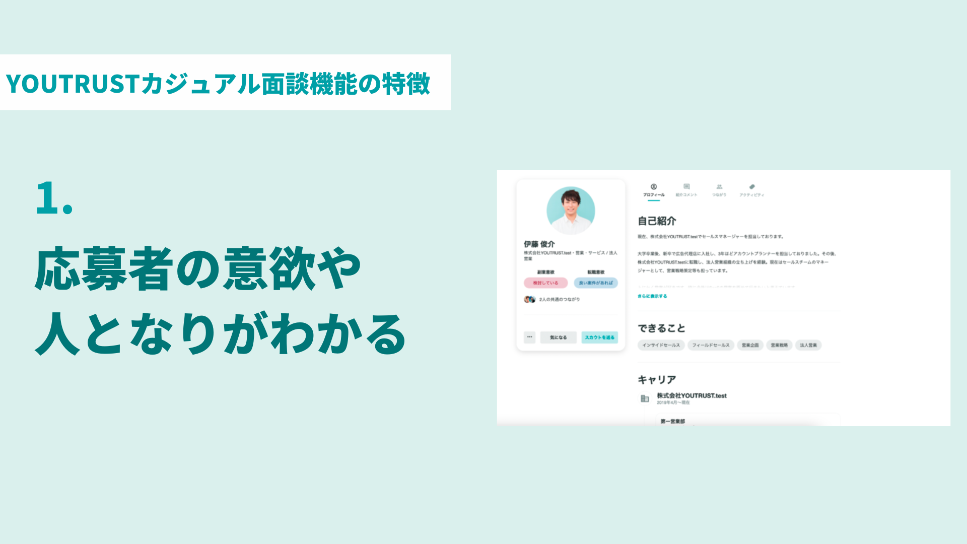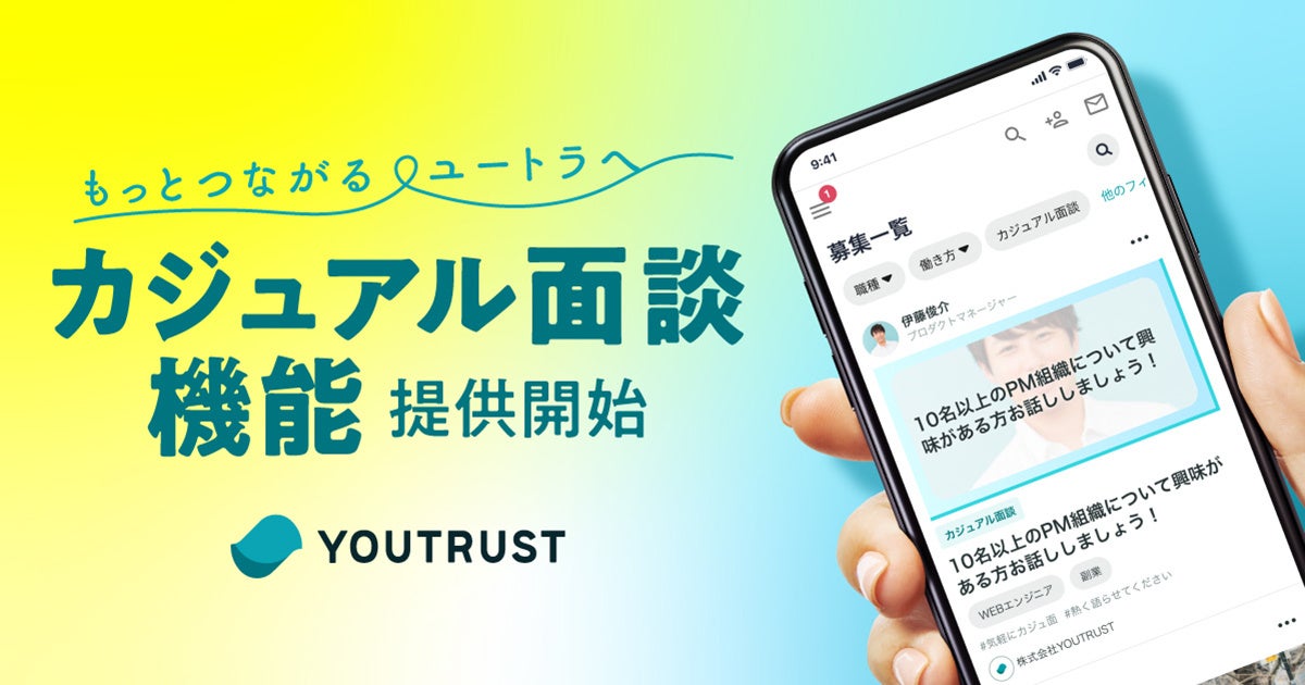 YOUTRUSTは信頼される人が最良のキャリアを歩めるように、つながりからキャリア・オポチュニティに出会えるSNSとして、累計約15万人以上の登録ユーザーさまにご利用いただいています(2023年1月時点)。今回、ユーザーさまから要望の多かった募集機能「カジュアル面談機能」の提供を開始いたします。(2月20日時点では、募集作成はPC版のみでのご提供です。)