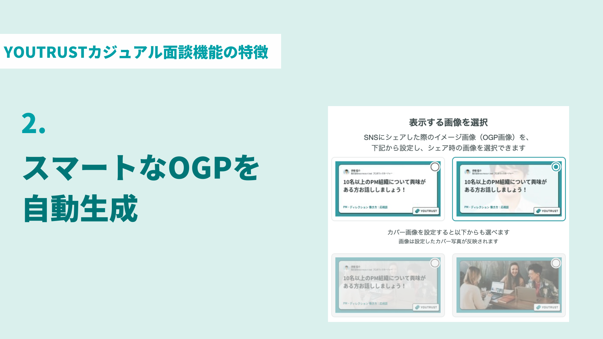 YOUTRUSTの新募集は、入力されたタイトルから自動で画像を生成します。より、こだわりたい方は画像を設定して独自のOGP画像を設定する事も可能となりました。加えてタグを設定する事で会社の魅力を伝えることもできます。