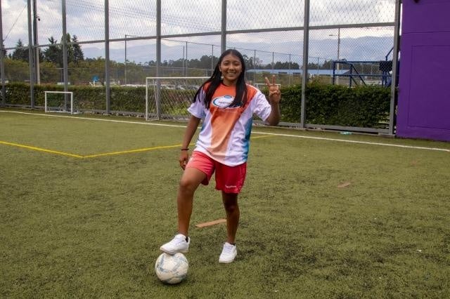 ワールド・ビジョンのチャイルド・スポンサーシップの支援を受けて育ったエバリンちゃんは12歳でプロサッカー選手契約をしました。彼女が暮らす地域ではサッカー合宿が支援の一環で開催され、サッカーを通して、子どもの権利やお金の価値、読解力や協調性について学んだり、真のチャンピオンの在り方について話し合います。エバリンちゃんは、プロ選手として練習を積む傍ら、地域内の啓発活動や学習の場にも積極的に参加しています。