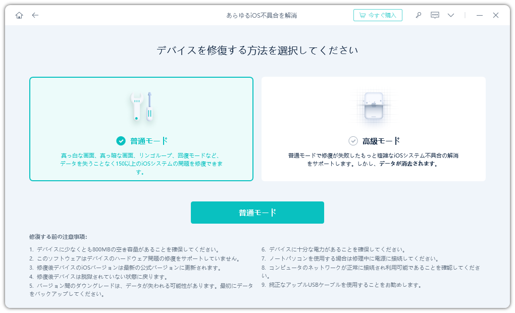 このiOS修復システムは、再起動ループ、フリーズ、クラッシュ、ブラックアウトなど、150以上のiOSシステムの問題を解決することが出来ます。また、iTunesによる修復ではデータ損失がやむを得ない場合でも、iOS修復システムではデータを失うことなく修復、復元することが可能です。