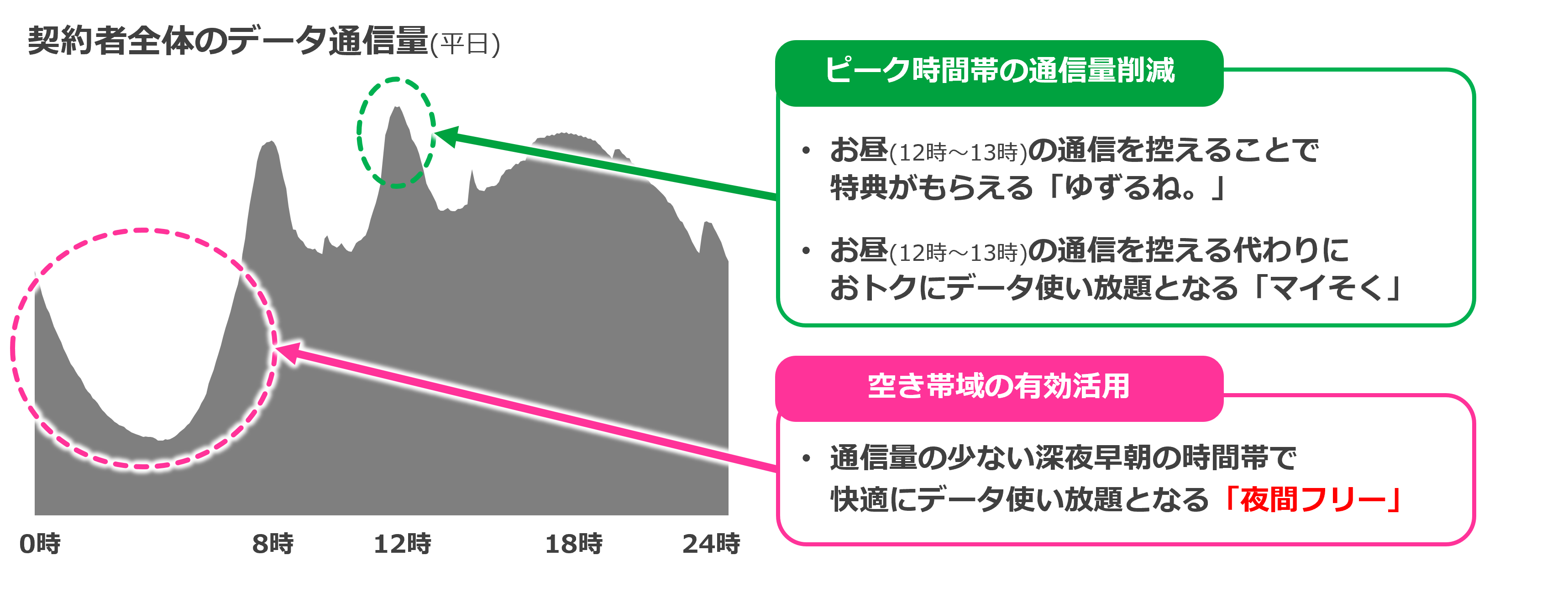 データ通信の速度や安定性といった品質を確保するためには、契約者全体の同時間帯における最大データ通信量(最大通信帯域)が重要な指標であり、特に利用者が急増する朝(8時~9時)、昼(12時~13時)、夕(17時~19時)の通信トラフィックを平準化することが重要となっています。そのためmineoはこれまで、会社員のお昼休みなどで最も利用者が多くなる月曜から金曜の昼12時~13時の通信トラフィック削減・平準化に向け、「ゆずるね。」や「マイそく」といったサービスを提供してまいりました。