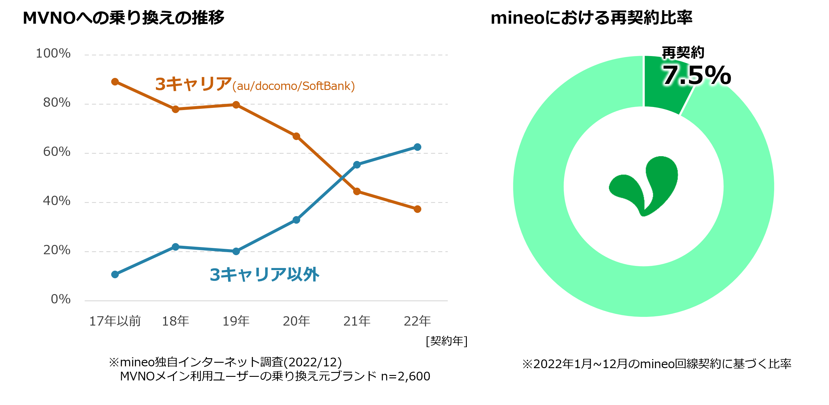 MVNO(格安SIM/格安スマホ)サービスが普及する中、国内大手3キャリア以外からMVNOへの乗り換え比率が増加しています(自社調べ)。MVNO間などで乗り換えが進んでおり、今後もその動きが続くと予想されます。実際に、mineoご契約者さまのうち、再契約者の比率は7.5%まで高まってきております。