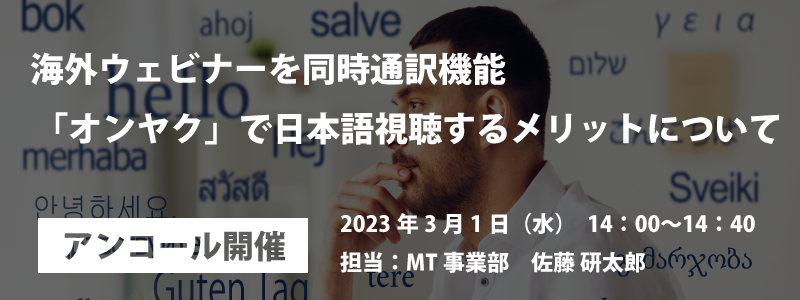 そこで本ウェビナーでは、海外の外国語ウェビナーの音声はもちろん、多国籍Web会議の発言等も瞬時に翻訳し、字幕のように映し出してくれる音声翻訳ツール「オンヤク」のデモンストレーションをお届けします。音声が次々と翻訳/文字起こしされていくテキスト表示の超スピードをぜひ実感してください。