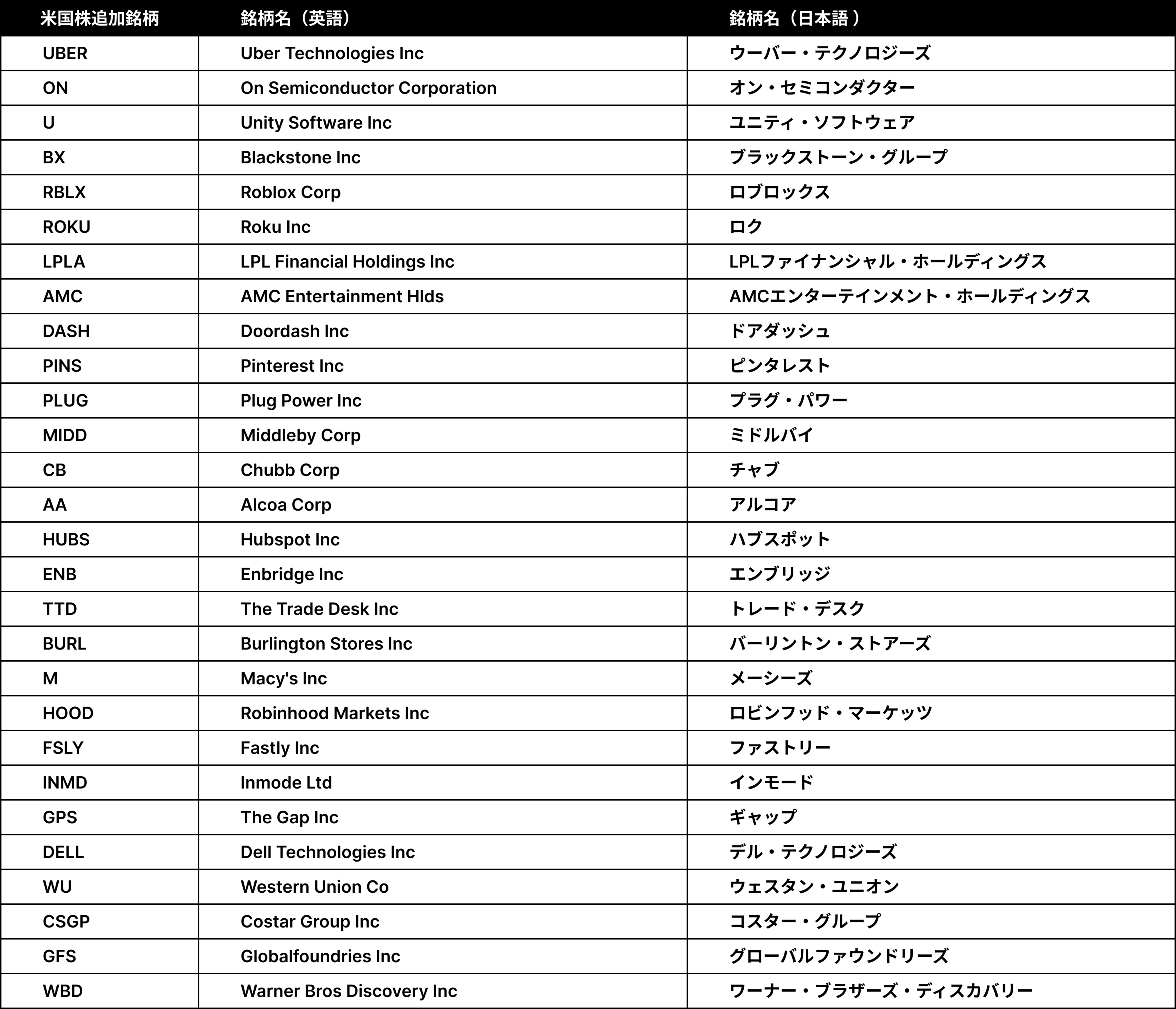 すでにアプリにおいて、計560銘柄をこえる米国銘柄が1000円から取引できるようになっています。今回新たに追加した51銘柄(米国株、ETF)は、下記の通りです。