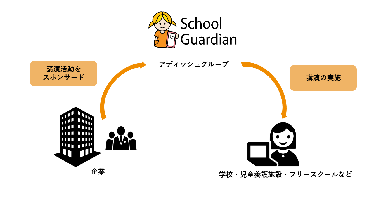 本取り組みは、企業が講演活動のスポンサーとなり、アディッシュグループのスクールガーディアンが学校や児童養護施設、フリースクールなどへインターネットリテラシー講演を実施します。講演を通じて、子どもたちがICTを適切に利活用できる力や、デジタル・シティズンシップ(※1)の考え方を身につけることができる環境を整備していく取り組みになります。