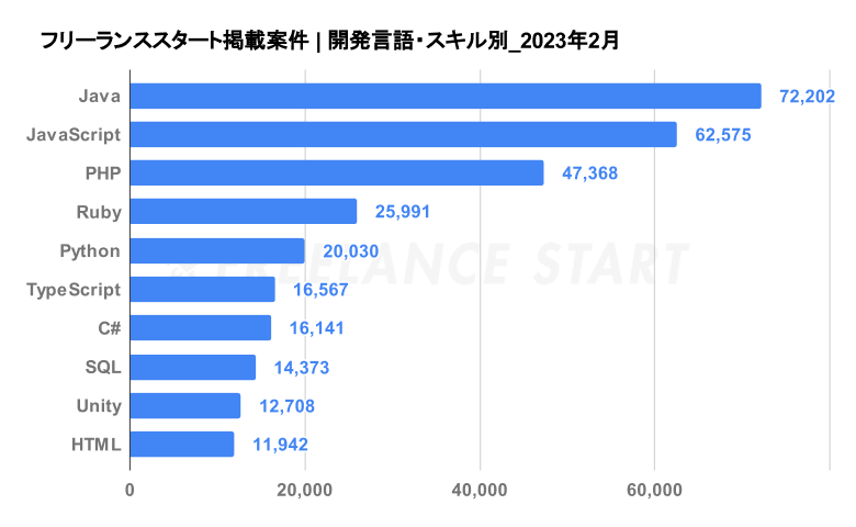 フリーランススタート調べにおける、開発言語・スキル別掲載案件数は汎用性の高い開発言語であるJavaが圧倒的に多いです。