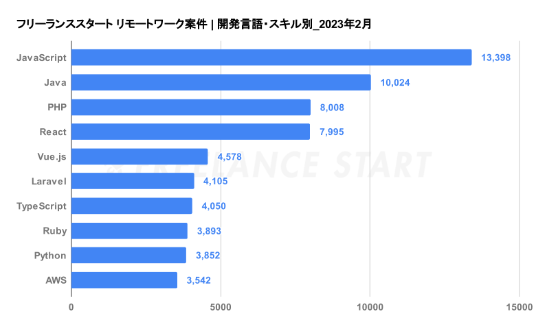 フリーランススタート リモートワークの掲載案件を開発言語・スキル別に見てみると以下の通りです。