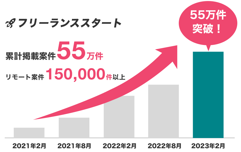 2023年2月時点、フリーランススタートではリモートワーク可能な案件を150,000件以上取り扱っており、さらに5ヶ月間でリモートワーク案件は約60,000件増加しています。