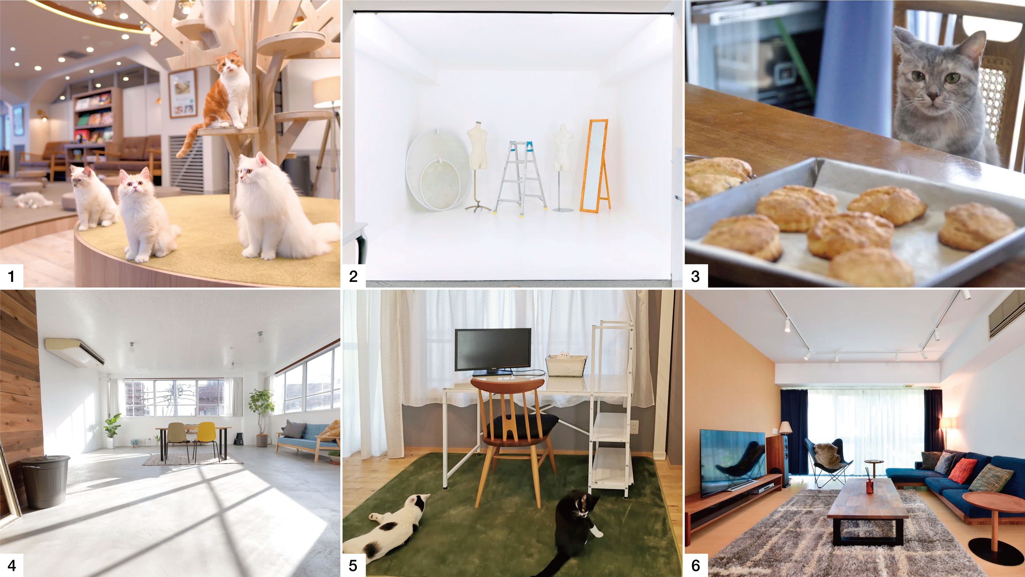 1.猫カフェMOCHA渋谷公園通り店、2.AIKEY STUDIO、3.ねこパンLab、4.Studio PATAKA、5.ソフィア百花園、6.六本木デザイナーズハウススタジオ