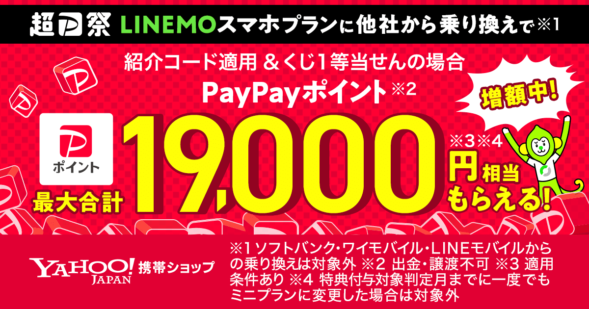 ・特典内容:「超PayPay祭」期間中に特典ページを経由し、“LINEMO”サイトにてYahoo! JAPAN IDでログインしてスマホプランに申し込むと、他社からの乗り換え(※1)の場合、PayPayポイント(※3)を14,000円相当、新規契約の場合、6,000円相当を付与 (※2)