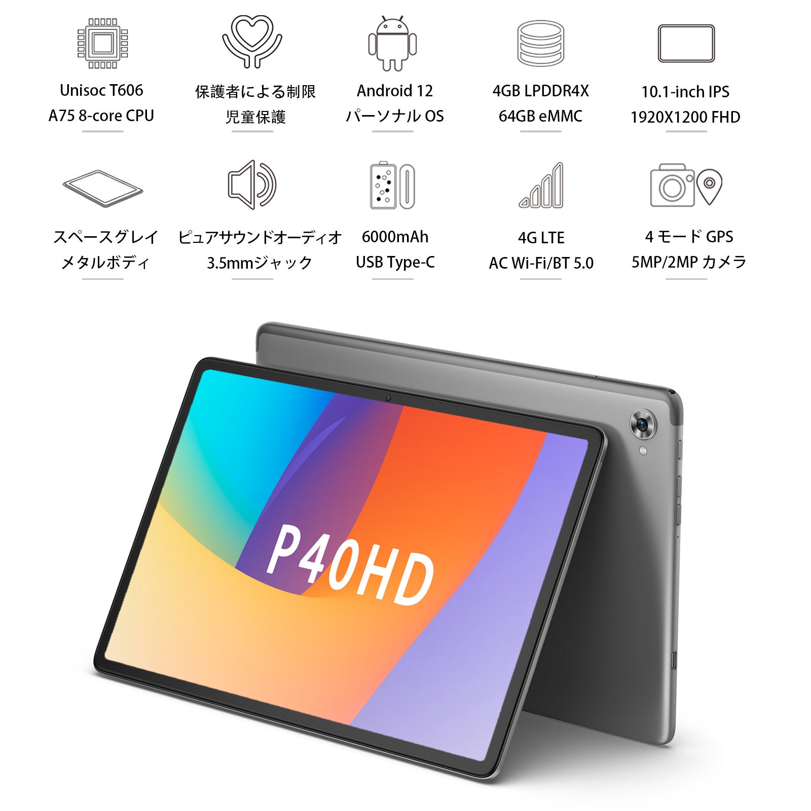 TECLAST P40HD Android 12 タブレット は高性能Unisoc T606を搭載して、8コアCPUで最大周波数2.0Ghz対応する。GPUには高性能なMali-G57を採用し、グラフィックス処理機能を強化しました。低消費電力と低発熱を実現でき、様々な機能が強化されており、より軽快な動作と高速な処理が可能になります。大容量の長持ち6000mAhバッテリーで、動画、音楽、ゲームなど時間を気にせずたっぷりお楽めます。