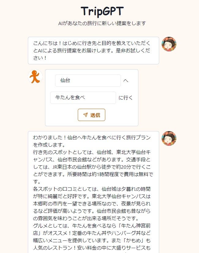「TripGPT」では、行き先と目的を入力することで、AIが自動で旅行プランを組み立てます。組み立てられた旅行プランをもとに宿泊日数や詳細な行先をAIとのやりとりにより調整し、利用者が求める旅行プランを提案します。