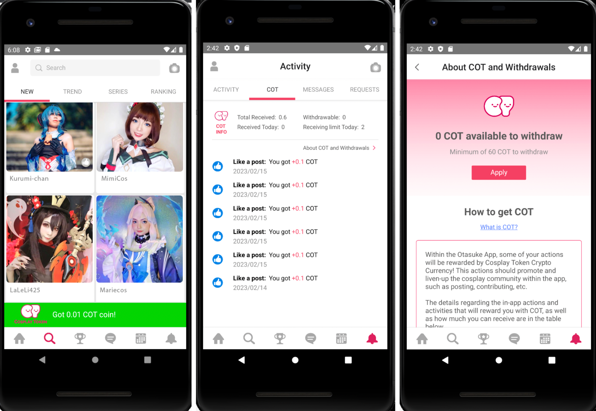「Otasuke」コスプレコミュニティアプリでは、アプリ内での活動(コンテスト参加、Like、投稿、フォロー、コメントなど)をコスプレ業界への貢献とみなし、COTを付与するシステムを開発、2023年3月下旬頃にリリース予定です。
