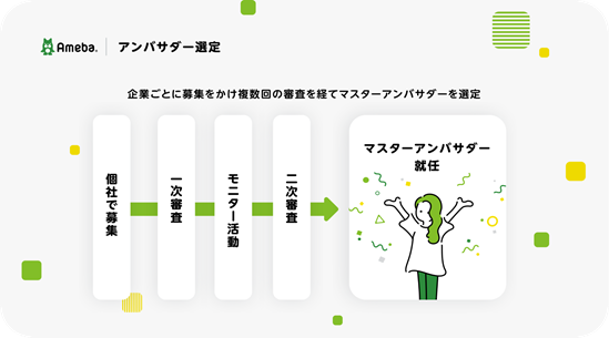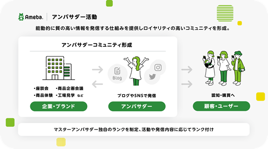 『Ameba協業マスターアンバサダープログラム』はAmebaブロガーの中から複数回の審査を経て自社に合った「マスターアンバサダー」を選定し、ファンマーケティングを支援する協業プログラムです。製品企画会議、工場見学といった多種多様なイベントを通じてマスターアンバサダーと企業が双方向のコミュニケーションを図ることで、ロイヤリティの高いファンコミュニティを形成し、マスターアンバサダーによる自主的な活動を促進します。ポストCookie時代において、ゼロパーティデータを活用したマーケティングを実現します。