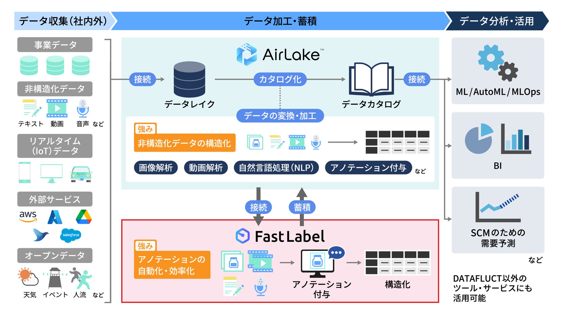 本合意に伴い、2022年6月29日(水)より、当社のアノテーションプラットフォーム『FastLabel』と、DATAFLUCTの非構造化データを構造化して価値に変えるノーコードクラウドデータプラットフォーム『AirLake』の連携が実現し、多種多様なデータを掛け合わせて新たなインサイトの理解や課題の解決を促進させます。