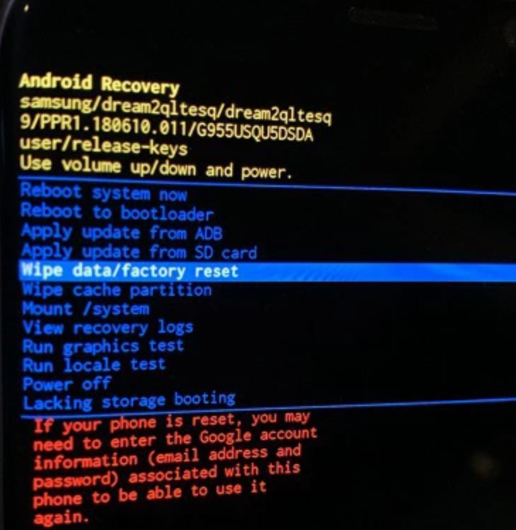 ステップ4:「音量-」ボタンで「Wipe Data/Factory Reset」オプションを選択し、電源ボタンで実行します。