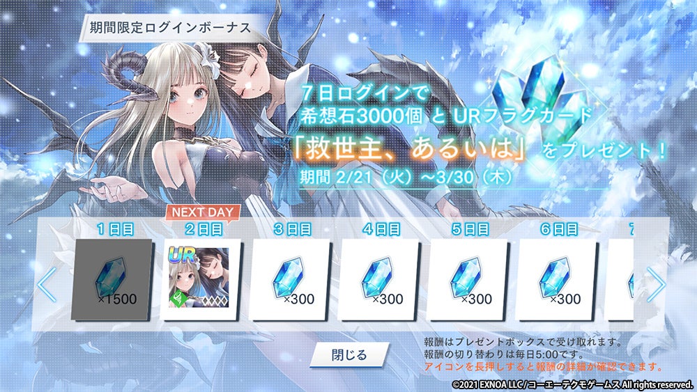 7日間ログインすることで合計3,000個の希想石(無償)と最高レアリティのURフラグカードを1枚プレゼントいたします。