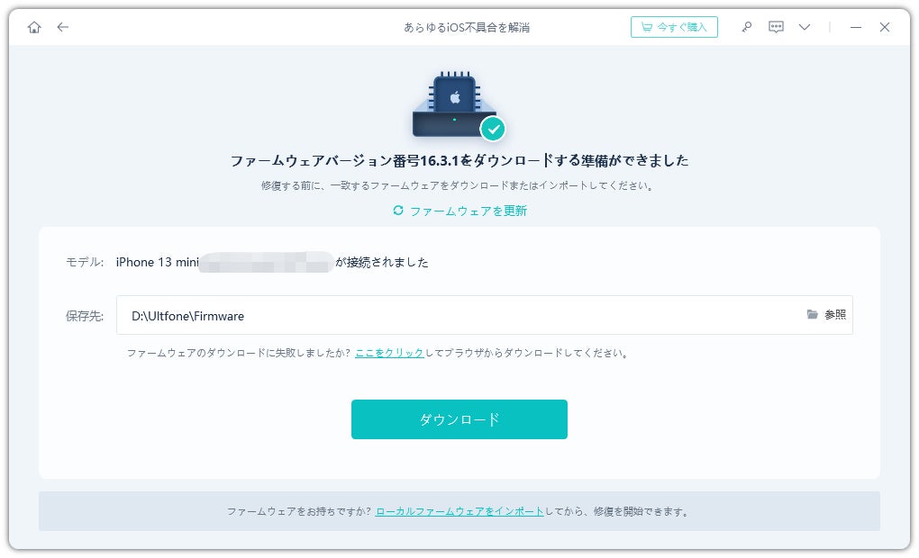UltFone iOS System Repairがあれば、iTunesなしで古いバージョンのiOSをインストールする方法をもはや模索する必要はありません。この記事で前述した、ファームウェアダウンロード画面まで進んで下さい。