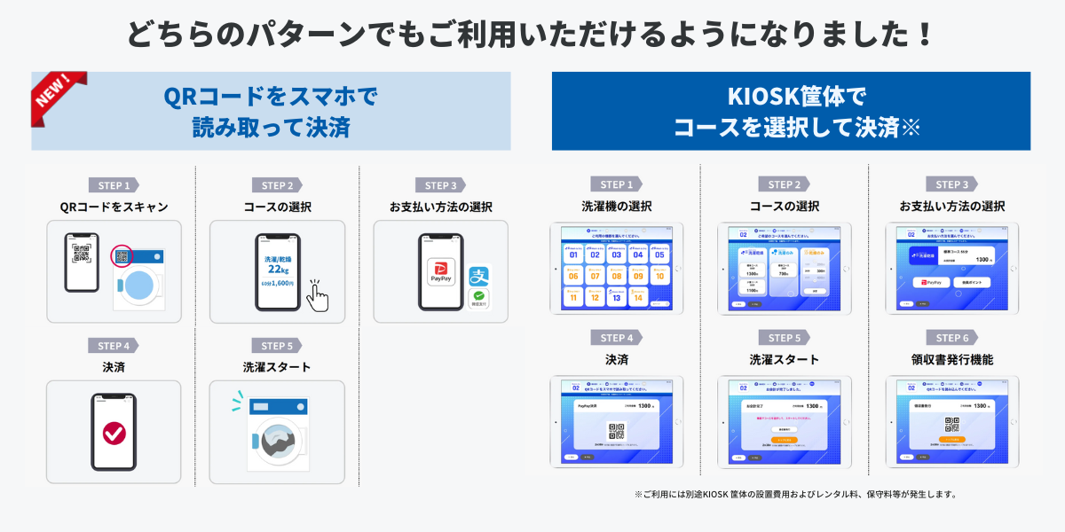 今までは、専用KIOSK筐体を操作してコースを選択し、最後に筐体のタブレットに表示されるQRコードを読み込んで、支払いを行っていました。今回のリニューアルによって、洗濯機ごとに表示されているQRコードをスマホで読み取り、スマホの画面に表示される案内に従ってコース選択・支払いを行います。