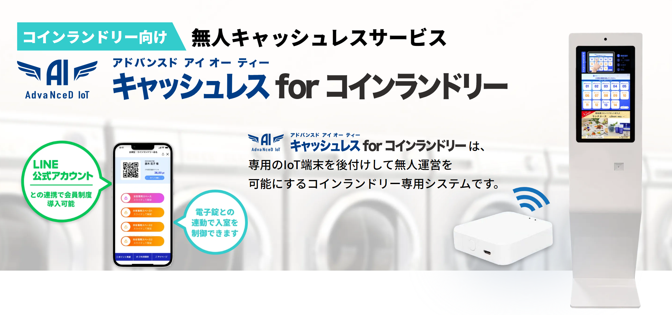 AdvaNceD IoTキャッシュレス for コインランドリーは、現在導入されている洗濯機や乾燥機に専用のIoT端末を後付けするだけでキャッシュレス決済が導入できるコインランドリー専用のシステムです。