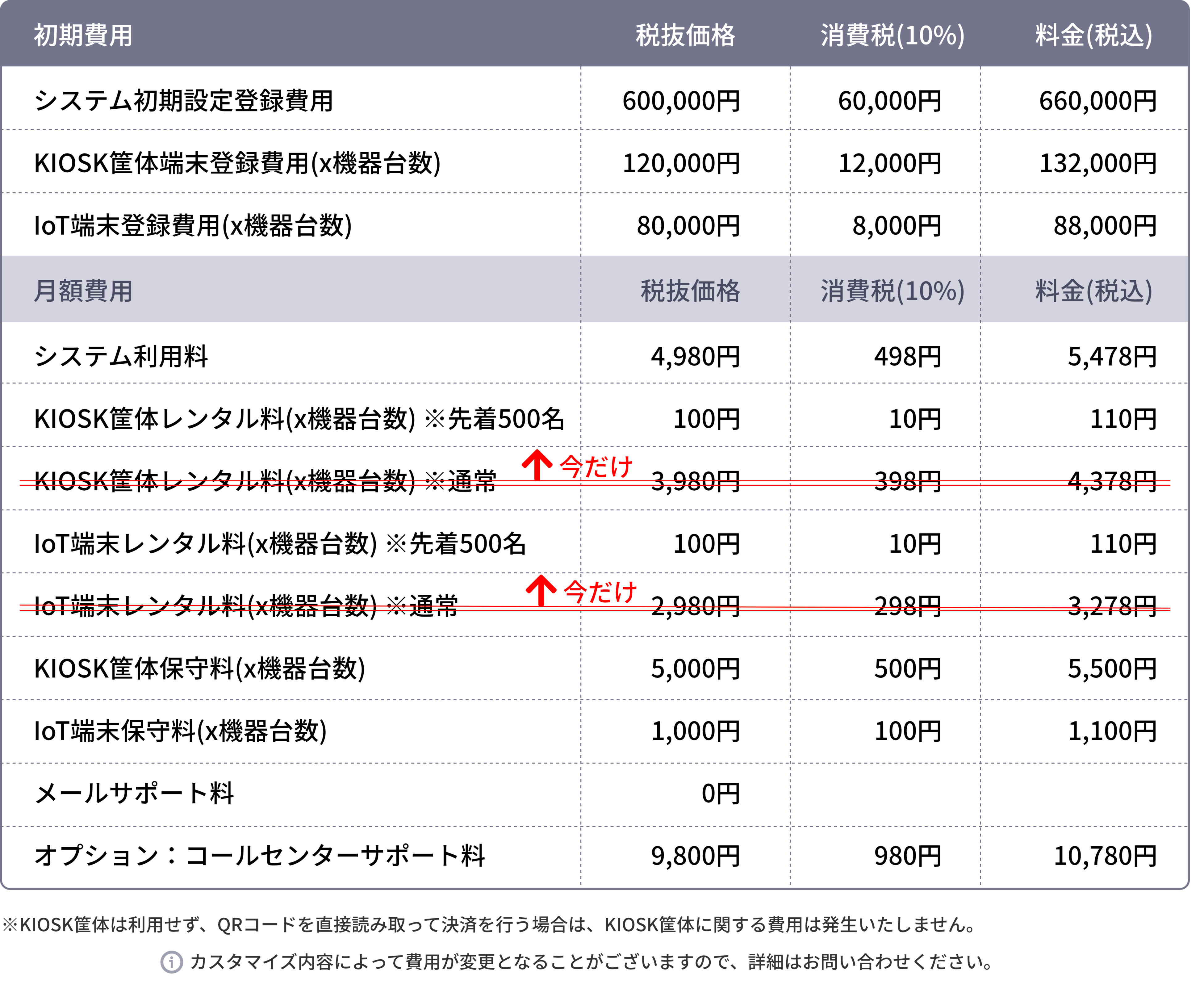 ◎今なら先着500名様限定でIoT端末とKIOSK筐体のレンタル料がそれぞれ100円/台(税抜)になるキャンペーンも行っておりますので、月々のランニング費用を抑えられます。
