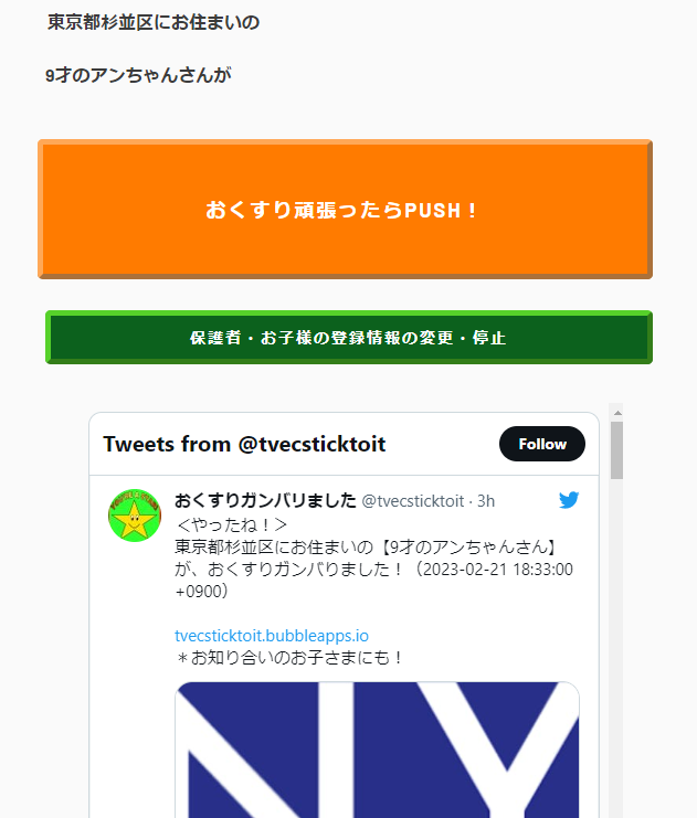 ログイン後画面:お子さまのニックネーム登録後、薬がんばったらPUSHボタンを押すとTwitterに自動でガンバリがUPされる