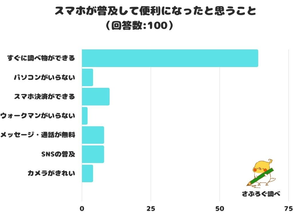 スマホが普及して便利になったと思うことをアンケートにて調査したところ、1位は「すぐに調べ物ができる」でした。